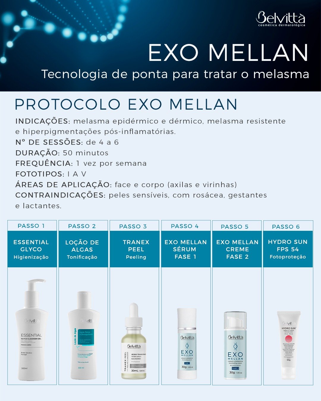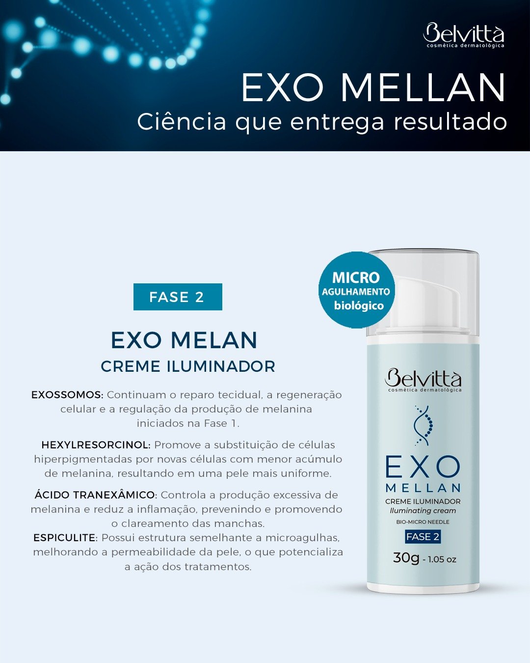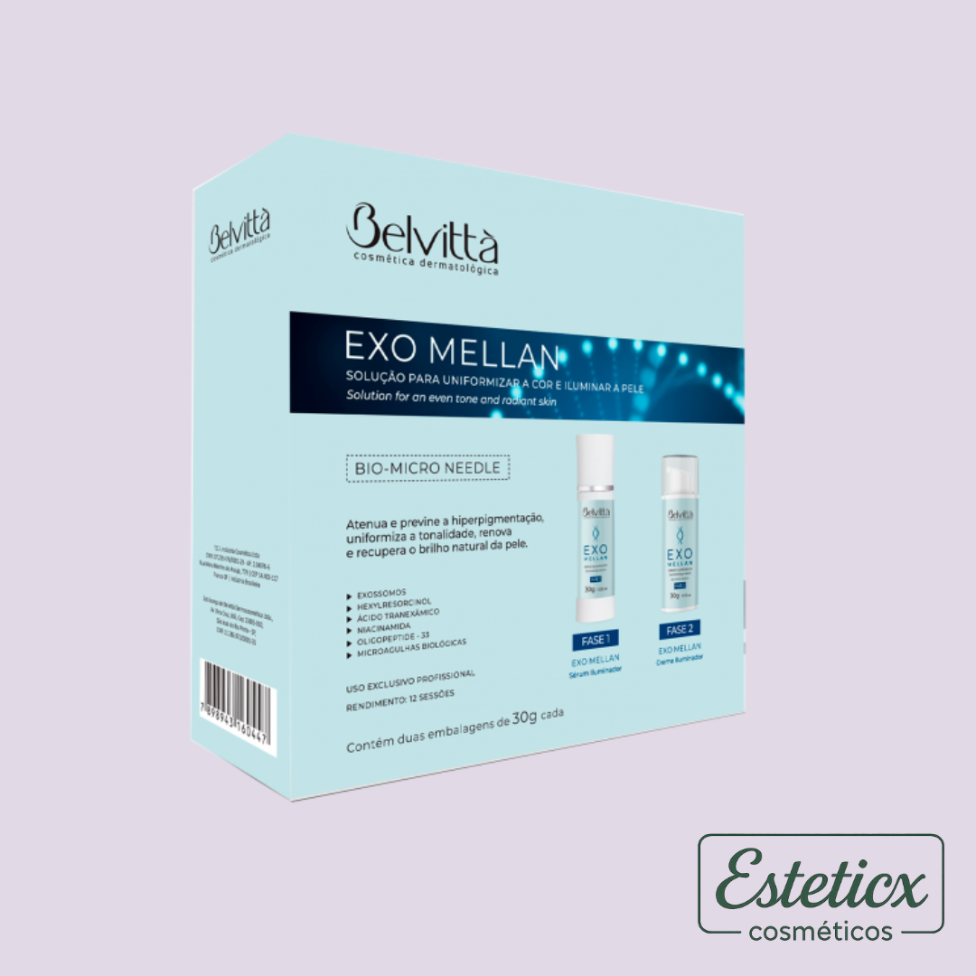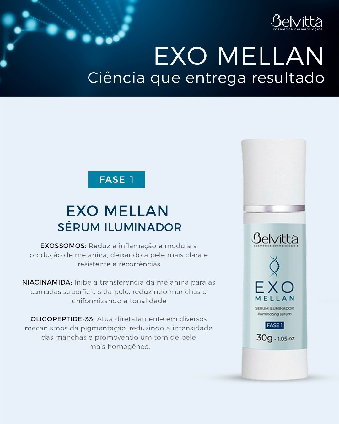 EXO MELLAN é um tratamento clareador e iluminador multidimencional em duas fases com Exossomos, Microagulhas biológicas, Hexylresorcinol, Ácido Tranexâmico, Niacinamida e Oligopeptideo 33 que atuam de forma sinérgica para tornar a pele mais clara, uniforme e iluminada.